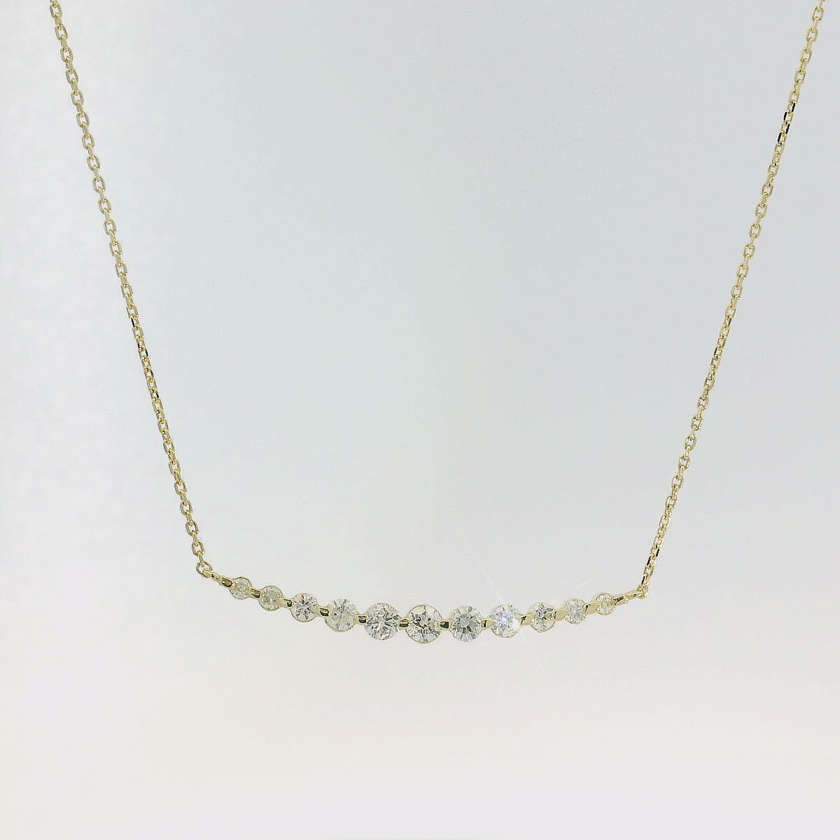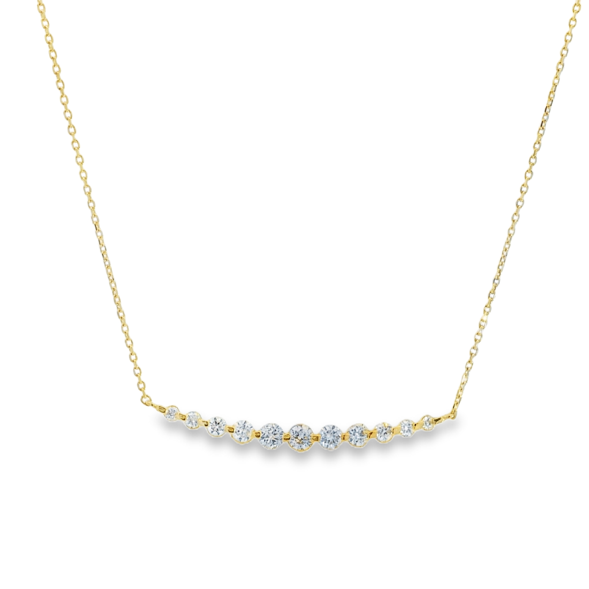This elegant Graduated Curved Diamond Necklace features a curved bar of graduated diamonds on a dainty chain. Its unique design adds a touch of sophistication to any outfit. The delicate chain enhances the sparkle of the diamonds, making it a perfect piece for any occasion.